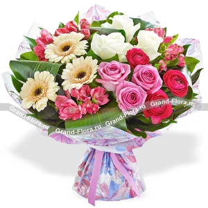 Лучезарность – букет с ирисами, альстромериями и хризантемой