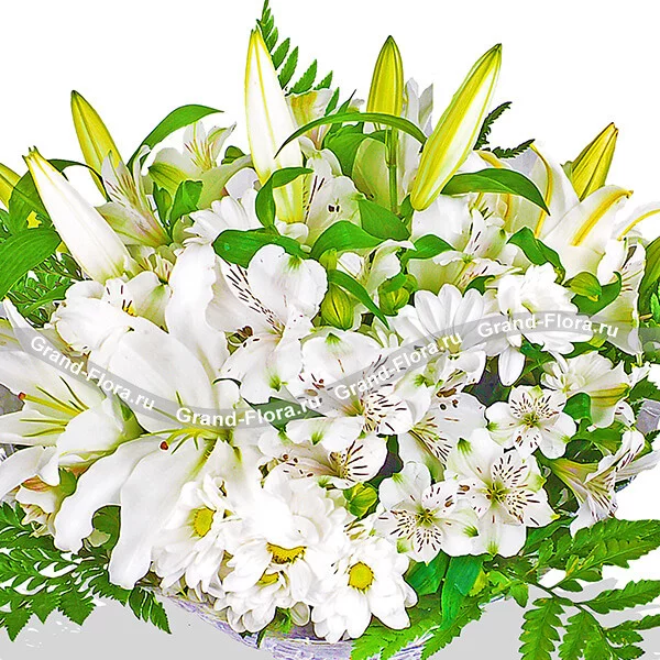 Стандартный: лилия белая - 2 шт., хризантема белая кустовая - 3 шт., альстромерия белая - 2 шт., декоративная зелень, фетр белый, бант зеленый.