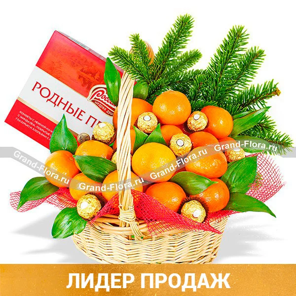 Отличный выбор для подарка друзьям или близким. Мандарины — свежие и ароматные, конфеты родные просторы и ферреро, свежие, ель мне кажется даже с еловым запахом была. Очень рекомендую! Отличный магазин