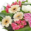 Стандарный: роза белая - 2 шт., роза розовая - 3 шт., альстромерия розовая - 2 шт., гербера кремовая - 2 шт., кустовая роза розовая - 2 шт., лист аспидистра - 3 шт., упаковка розовая, лента розовая. Примерный размер: 25Х25 см.
