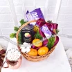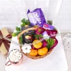 Стандартный: чай Липтон - 100 г., печенье "Milka" - 168 г., шоколад "Milka" - 100 г., мандарины - 5 шт., хлопок - 1 шт., ель, декор, корзина.